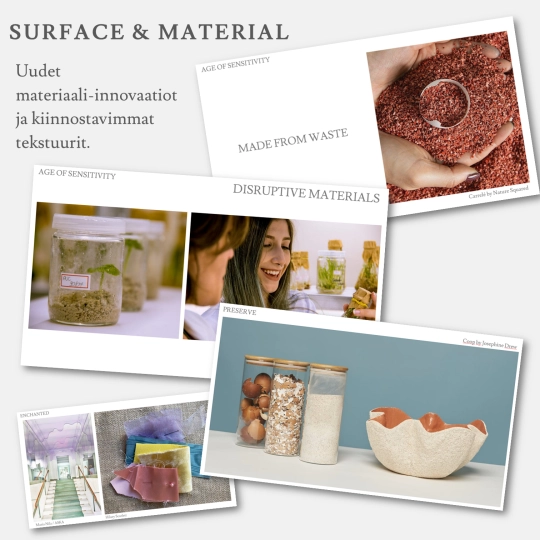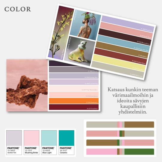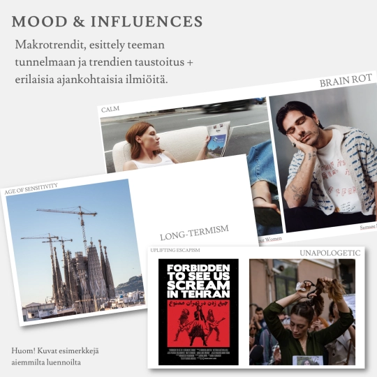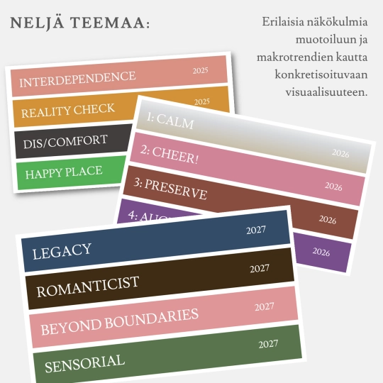 Pyrimme tuomaan inspiraatiota, ajatuksia ja teemoja sekä kesä- että talvikausien tuotteiden ja palveluiden ideointiin joten esitys on koottu useiden trenditoimistojen vuoteen 2027 keskittyvien aineistojen pohjalta ja kuulet ajatuksia myös uusimman syksy / talvi (AW) 2027-28 sesongin ennusteista.