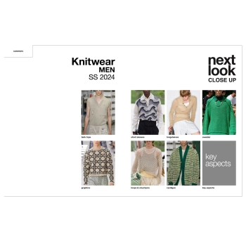 NEXT LOOK CLOSE UP on ammattijulkaisusarja, joka sisältää analyyseja kansainvälisten muotiviikkojen tuoreista mallistoista poimituista tuoteryhmistä. Kokeneet suunnittelun ammattilaiset analysoivat tarkkaan kaikki näytökset poimiakseen vaikuttavimmat tuotesuuntaukset.